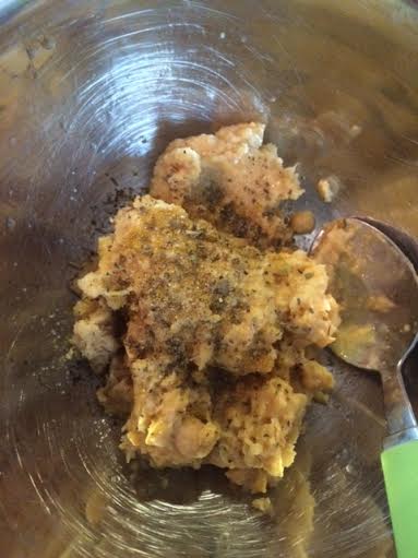 Ingrédients : Une boite de pois chiches, de la feta nature, du curry en poudre, chapelure, sel, et poivre, ciboulette.
