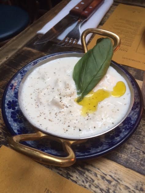 Nous avons opté en entrée pour la Stracciatella fondante fumée, c’est à dire le crémeux de la burrata (7€). C’est très bon, et juste copieux comme il faut pour ne pas être écœuré.