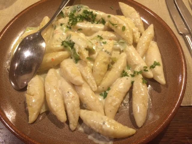 Si vous n’êtes pas adeptes, des salades, ou encore des plats de pommes de terre vous réjouiront. Nous avons choisi en entrée des oignons rings avec une sauce au fromage bleue. Une entrée délicieuse ! Monsieur a choisi ensuite une joue de porc et moi des gnocchis au Nova blue cheese. Malgré un cafouillage dans les plats, j’ai réussi à déguster mes gnocchis, un plat copieux et très goûteux ! Monsieur était ravi du sien.