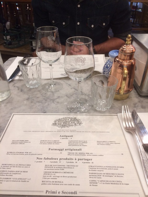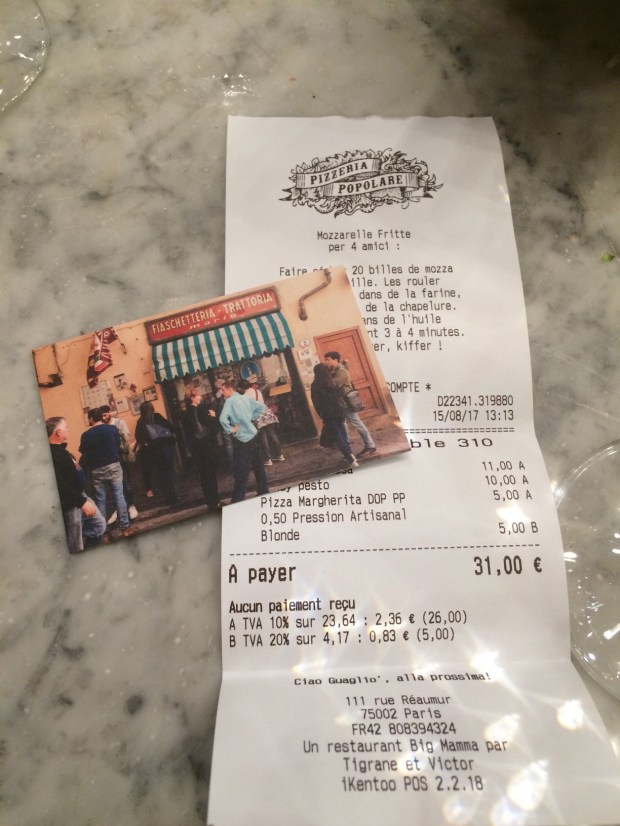 On ne présente plus le groupe Big Mamma, fondé par Tigrane et Victor, qui a ouvert 6 restaurants en 2 ans. Leur spécialité : la trattoria italienne, le produit du terroir, jusque dans l’accent des serveurs. Ayant eu vent de leur fameuse pizza à prix raisonnable « comme à Naples », leur premier prix est à 5€, et après avoir dîné chez East Mamma et chez Ober Mamma, je profitai du 15 août pour découvrir leur dernier né. Etant passée de nombreuses fois devant les vitres couvertes de bouteilles de toutes sortes, j’avais hâte de découvrir l’intérieur.
