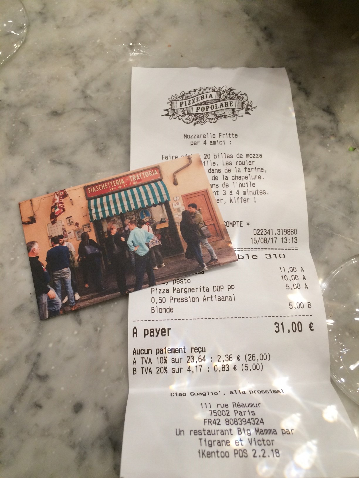 Addition : 31€ pour une Grosse Burrata crémeuse (11€) + 2 pizzas (15€)+ 1 bière pression artisanale (5€)
