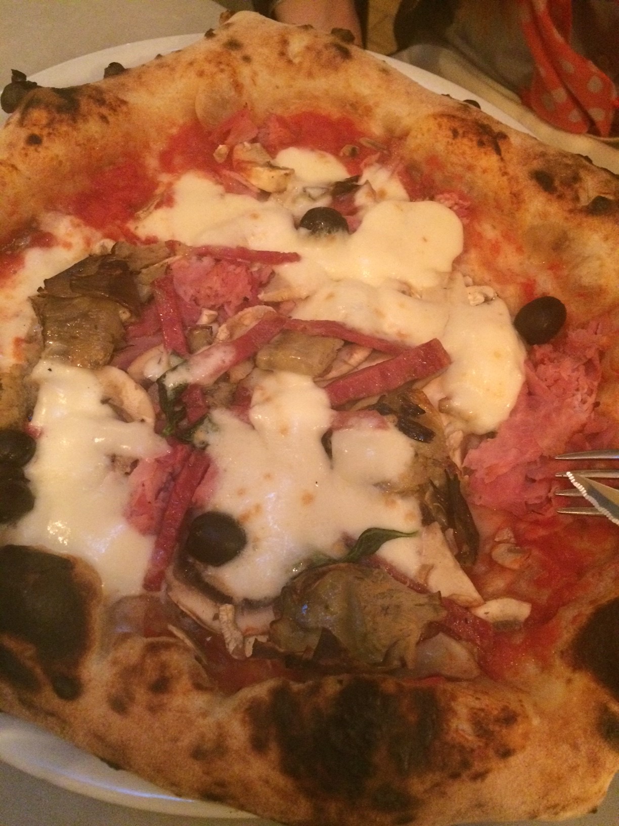 Et la cuisine dans tout ça : nous avons opté toutes les trois pour une pizza, une pizza végétarienne (14€), une pizza du jour avec sa burrata (12€), et une Capricciosa (14€). Trois grosses pizzas arrivent alors sur la table, avec leur pâte bien gonflée et leur garniture fondante. Ma burrata était une merveille, parfaitement crémeuse et posée sur son lit de roquette. J’ai eu un mal fou à la terminer car copieuse, mais la gourmandise a encore eu raison de ma faim, et il ne restait plus rien dans mon assiette.