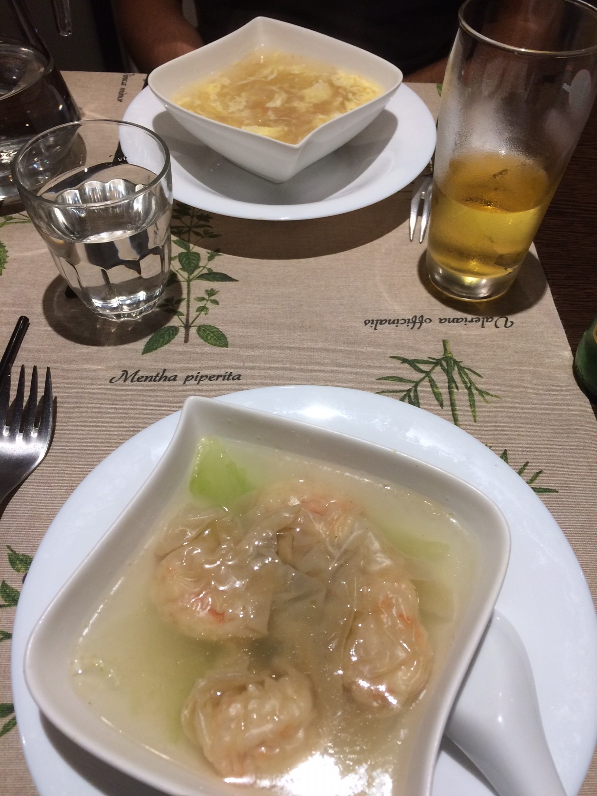 La carte propose des spécialités pékinoises mais aussi des classiques des restaurants chinois occidentalisés. Nous avons opté en entrée pour deux soupes : un potage d’asperge à la soupe de crabe (5€), et une soupe aux raviolis de crevettes (5€). Si le potage d’asperge est savoureux, j’ai trouvé ma soupe de ravioli un peu fade, mais les raviolis fait maison sont excellents.