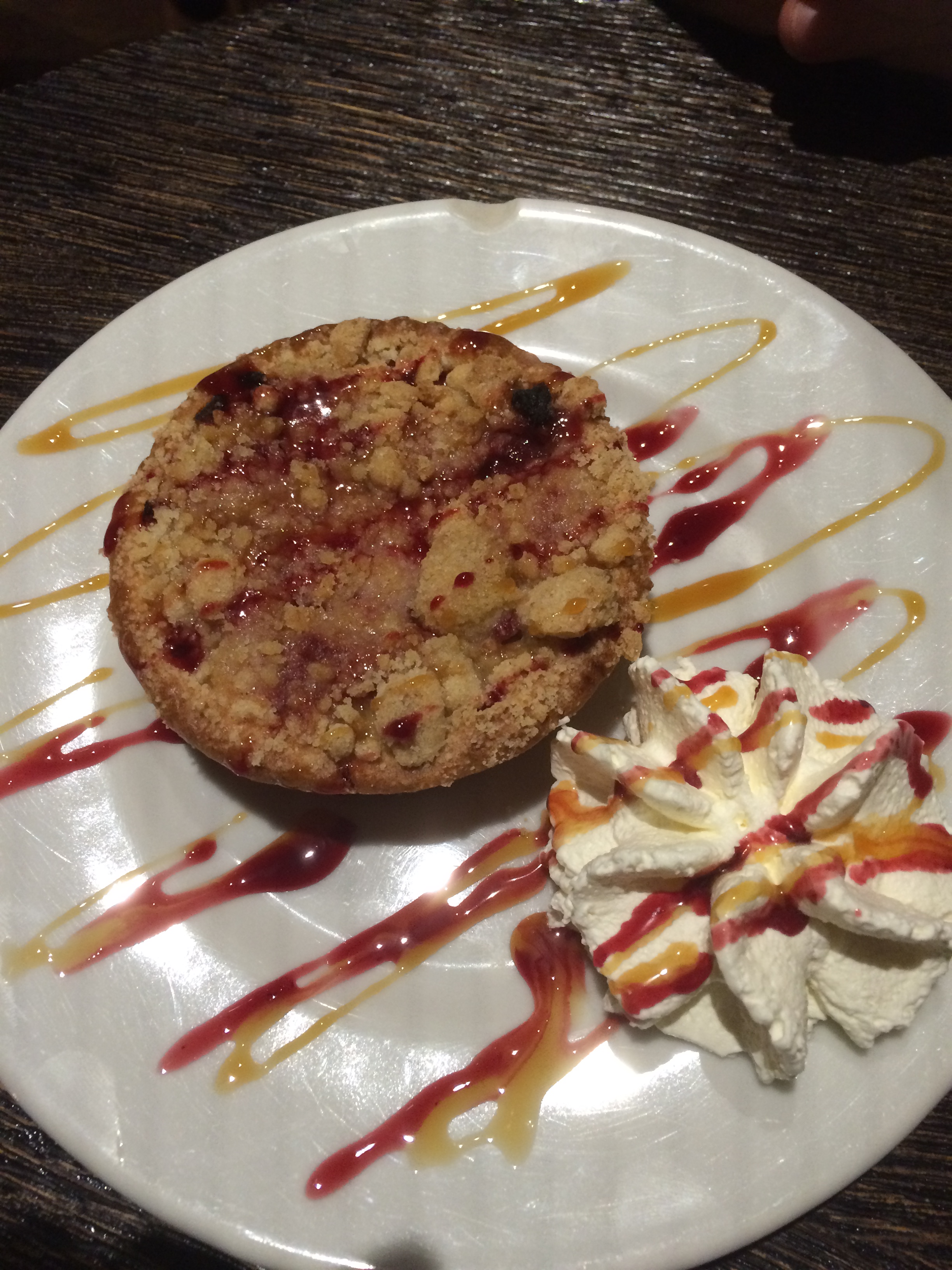 Monsieur a opté pour la formule burger : boisson + Burger + dessert = 17,5€. Le burger choisi, au poulet (12€) a récolté son approbation. Pour terminer, il choisissait, parmi la belle liste de desserts proposés, un crumble pomme fruits rouges. Le dessert est franchement bon également et bien copieux.