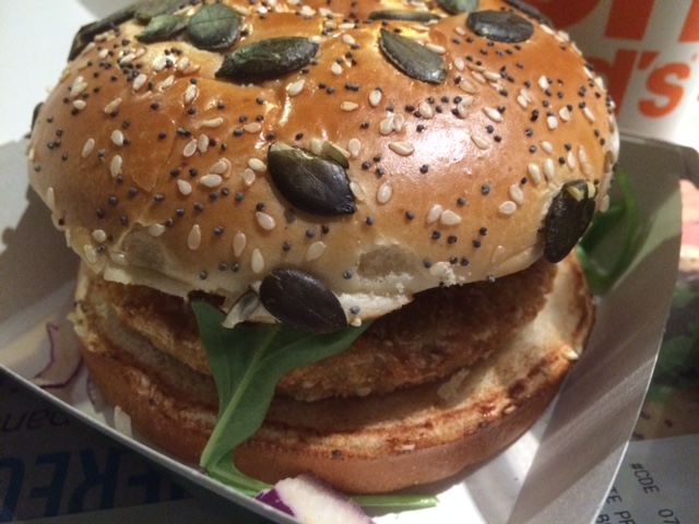 Alors il est vendu au prix de 5,20€. Il se veut grand. Et il l’est ! J’ai accompagné ce grand burger révolutionnaire d’une petite salade, et je suis sortie complètement repue. Il est donc copieux. Mais est-ce qu’il est bon ? L’exemplaire qu’il m’a été donné de manger manquait singulièrement de sauce pour me ravir. Toutefois, avec son bun parsemé de graines de courge, sa sauce pesto rosso (même s’il n’y en a pas assez), sa galette de carottes et salsifis, sa roquette et ses petits oignons, et bien … il assure !