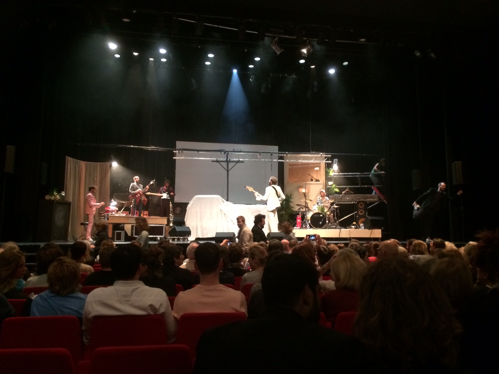 Adoré car cette bande de saltimbanques sait tout faire : comédien, humoriste, danseur, chanteur, musicien, bruiteur et j’en passe. Ils sont drôles, énergiques, émouvants, et chacun possède une personnalité qui lui est propre et qui se coordonne à merveille aux autres. Avant même que le spectacle ne débute, les comédiens sont déjà sur scène à accorder leur instrument, et certains viennent saluer le public et discuter. Ensuite, lorsque commence le show, c’est près de 2h de pur bonheur dynamisant.