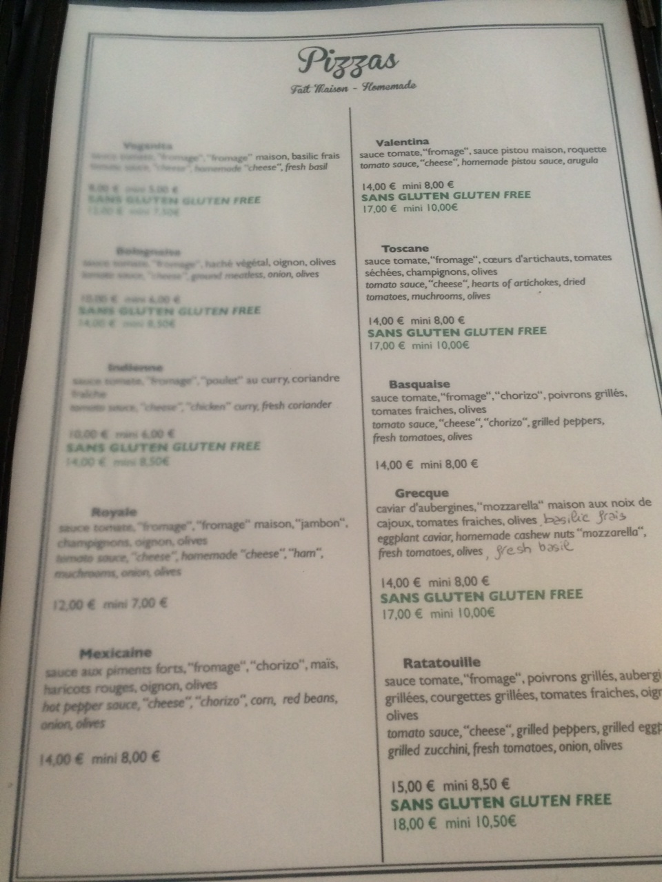 Et nous avons trouvé notre bonheur chez VEG’ART qui propose une cuisine 100% végétalienne, et une page entière dédiée aux pizzas, depuis la Veganita à 8€ (simple Margarita aux fromages végétals) jusqu’à la Ratatouille à 15€. Vous pourrez opter pour l’option sans gluten en cas d’intolérance, c’est toutefois plus cher. En cas de petit appétit, n’hésitez pas à choisir la « mini », disponible pour chaque pizza. Nous avons choisi la Veganita en version normale et mini.