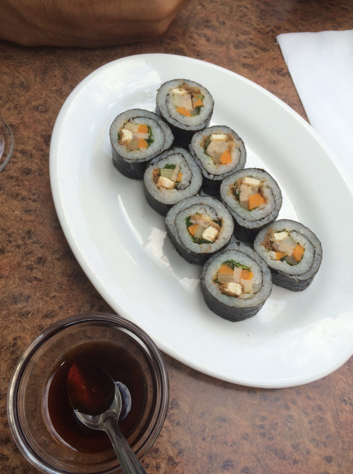 Les plats à la carte sont fait maison. En entrée, nous étions curieux de goûter des makis (5,50€) car on en a pas mangé depuis une éternité. Ceux-là sont constitués de légumes mais aussi d’un simili reproduisant le gout du poisson. Et bien c’est bluffant, et particulièrement perturbant, car si je ne connais pas le gout de la viande, je connais celui du poisson (pesco-végétarienne de naissance), et sentir un gout si proche m’a déstabilisée. C’était toutefois vraiment frais et très bon.