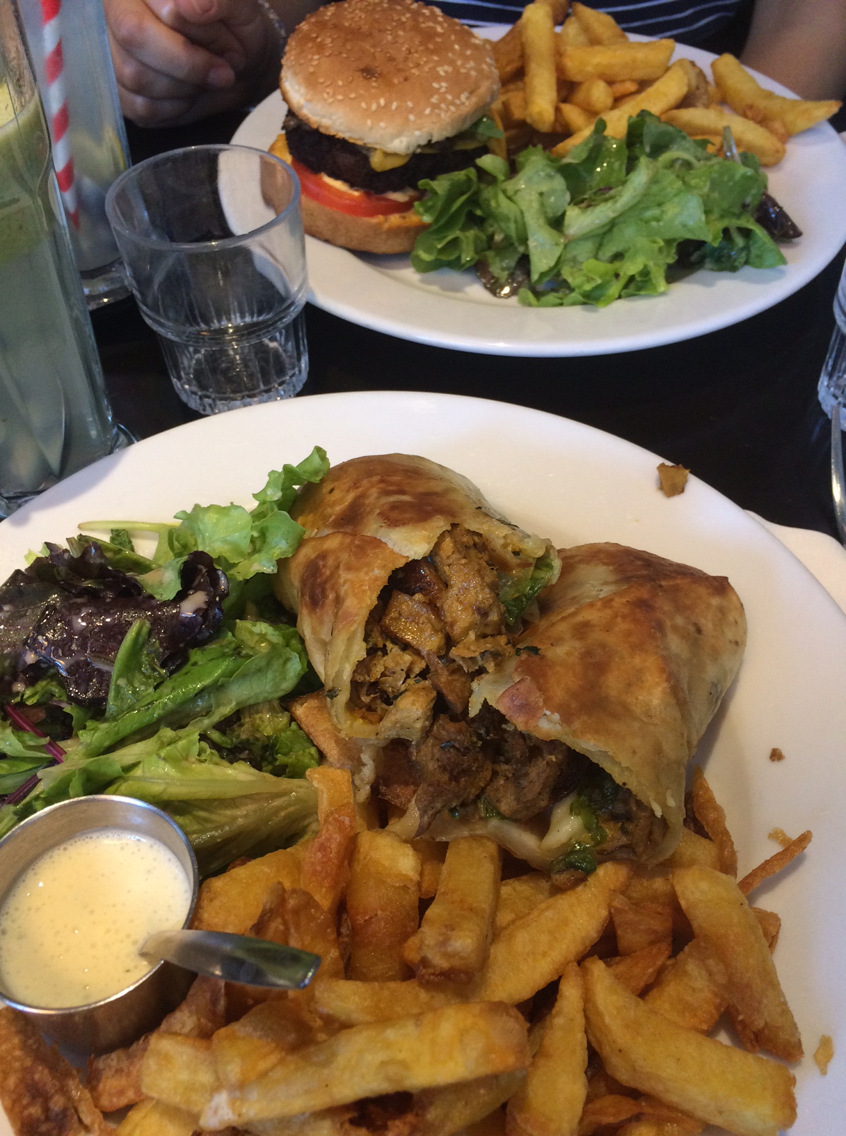 J’ai opté pour le kebab (12,90€) malgré avoir lu quelques critiques lui reprochant d’être sec. La portion est parfaitement copieuse, très roborative (merci aux protéines de soja et au seitan), et pour ma part je ne l’ai pas trouvé sec. Les frites accompagnant le plat sont faites maison, et plutôt pas mal. Les amis avec qui nous étions ont opté pour un burger (16,5€), qui avait l’air délicieux mais légèrement petit. Et la palme de l’assiette la moins copieuse revient au pad thai (14,5€) mais très bon (d’après le goûteur). Pour autant, du plat aux fabuleux desserts (banana split et gauffres), le test se révèle plutôt concluant. Seul mon jus kiwi+poire (5€ pour 2 fruits) ne m’a pas convaincue, il m’a paru dilué. Plusieurs autres fois, nous avons dégusté des pizzas, elles sont délicieuses !