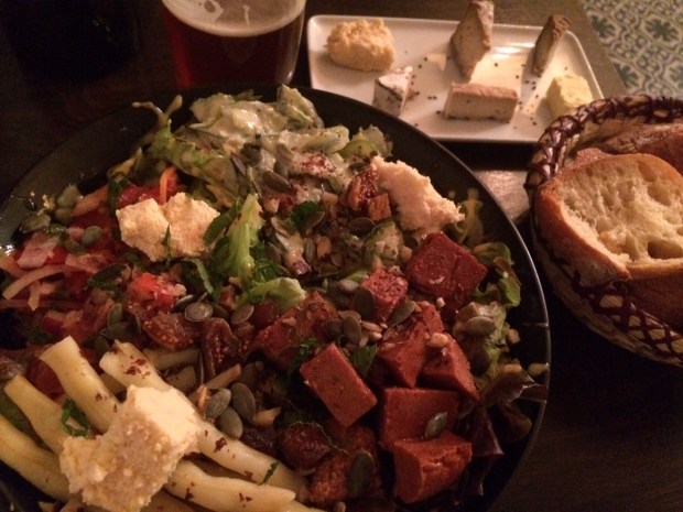 Parlons de la carte. Une carte courte, de saison, fait maison, bio et créative. Il parait que les champignons arrivent de la Chapelle en vélo. C’est formidable. A la carte, des tapas pour l’apéro, des plats du jour, des desserts et surtout. Surtout ! La planche de fromage (9€ la petite) . Parce que oui, il est tout à fait possible de faire fermenter les « laits » végétaux pour obtenir des fromages plus vrais que nature, et les recettes peuvent varier à l’infini. On a éprouvé une grande tendresse pour ce beurre salé tout doux, pour lequel il a fallu 7 mois de mise au point.