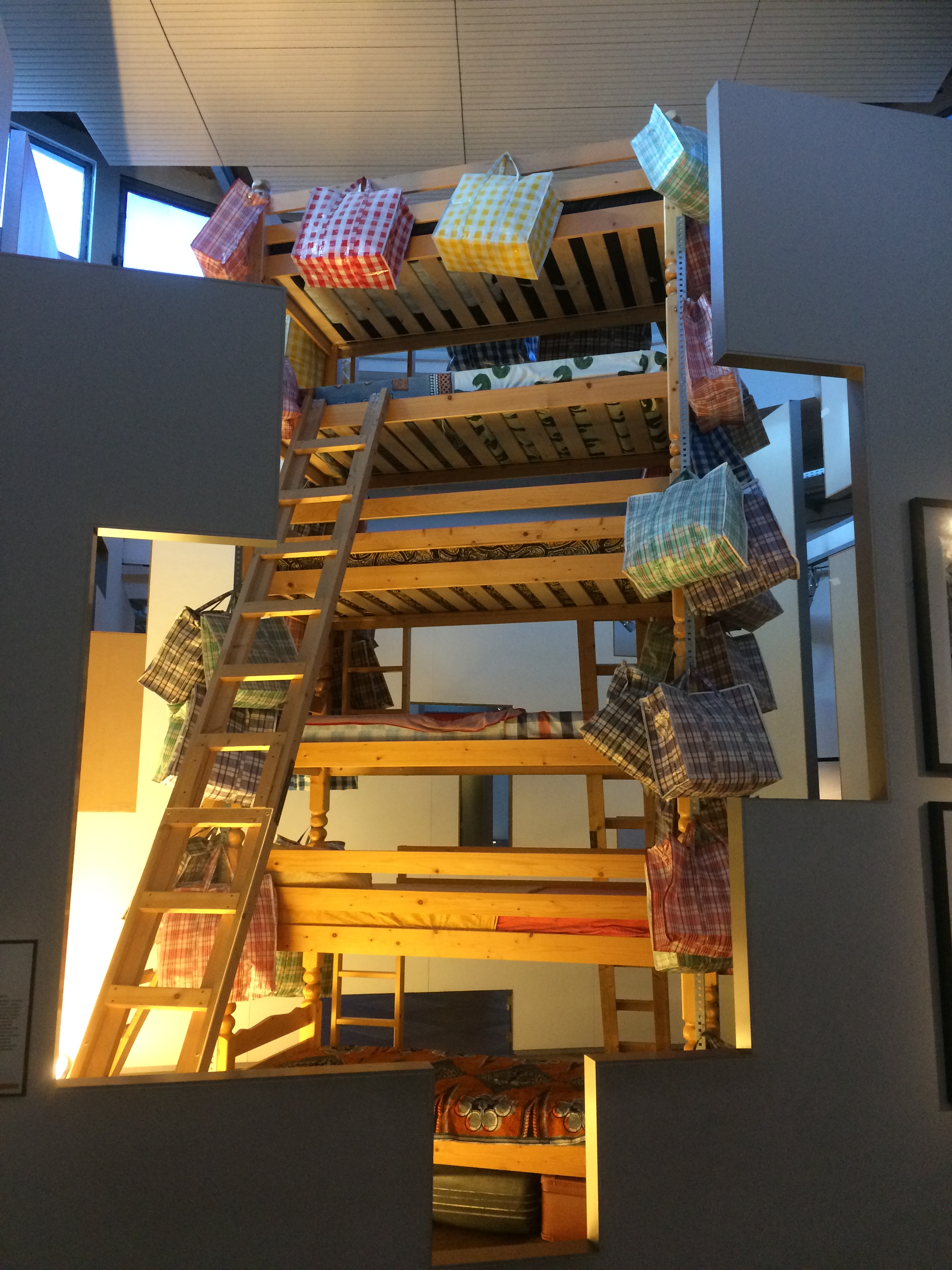 Outre l’histoire du palais de l’immigration depuis sa création, la majestueuse salle de fêtes et ses fresques coloniales, vous trouverez une exposition bien documentée au dernier étage. Celle-ci se propose de retracer l’évolution de l’immigration en France depuis le début du XIXe siècle jusqu’à nos jours au travers d’une scénographie thématique et chronologique. Cette exposition permanente s’organise autour de trois « matériaux » : les œuvres d’arts, la collection de documents historiques ainsi que celle des objets ethnographiques. L’exposition est aussi sonore, vous invitant à retrouver au delà des lignes de textes et des objets, une ambiance sensorielle immersive. Si je l’ai parcourue relativement rapidement, j’en ai trouvé le fonds et la forme plutôt intéressants et permettant de remettre dans leur contexte les grandes vagues d’immigration passées et présentes.