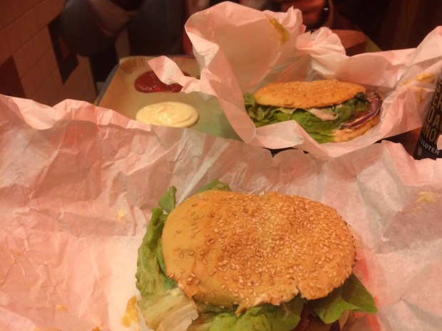 Gaby Super Natural burger : A l’heure où je vous écris, ce petit, tout petit restaurant de la rue d’Argout (Paris 2ème) a ouvert il y a deux mois. La salle de restaurant est absolument minuscule avec ses trois tables hautes. Vous prendrez ici votre burger plutôt à emporter, en version grande ou petite (de 6 à 11€ selon le burger seul selon le type et la taille), la taille des buns change vraiment. Le steak actuel est fait de seitan et de tofu, mon tout est tout plat et se casse complètement la gueule, c’est assez artisanal. Mais nous, on a passé un super bon moment. C’est bon, c’est copieux et tout est fait maison (sauf le bun).