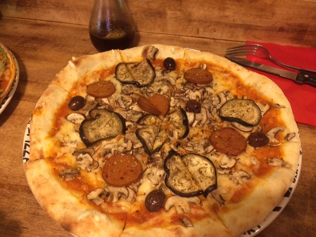 A l’heure où manger dans une pizzeria signifie souvent pour un végétalien opter pour une végétarienne sans fromage, c’est un vrai plus que d’avoir le choix dans les ingrédients. Les végétaliens sont gâtés avec de la mozzarella végétale Violife et des simili viande de la marque Wheaty (chorizo, jambon). On a partagé nos recettes, l’une avec et l’autre sans gluten, et l’une comme l’autre des pizzas nous ont complètement convaincus. En revanche, le fromage végétal est très bourratif, j’adore ça, mais alors, je sors toujours bien repue lorsque je mange une pizza en contenant. Sans compter que nous avions opté pour la grande pizza.