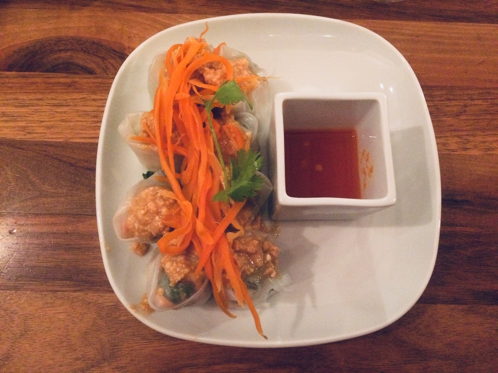 La carte n’est pas très longue. Vous trouverez 6 entrées, 6 plats et 4 desserts. Pourtant, j’ai déjà eu un mal fou à choisir parmi toutes ces options qui semblent si goûteuses. En entrée j’ai opté pour les rouleaux de printemps (9€) accompagnés de leur petite sauce. Un délice, j’aurais simplement aimé un petit peu plus de sauce pour tremper mes rouleaux. Leur présentation est particulièrement graphique. Les salades de mangue (10€) et de papaye (9€ )sont elles aussi colorées et délicieuses (10€).