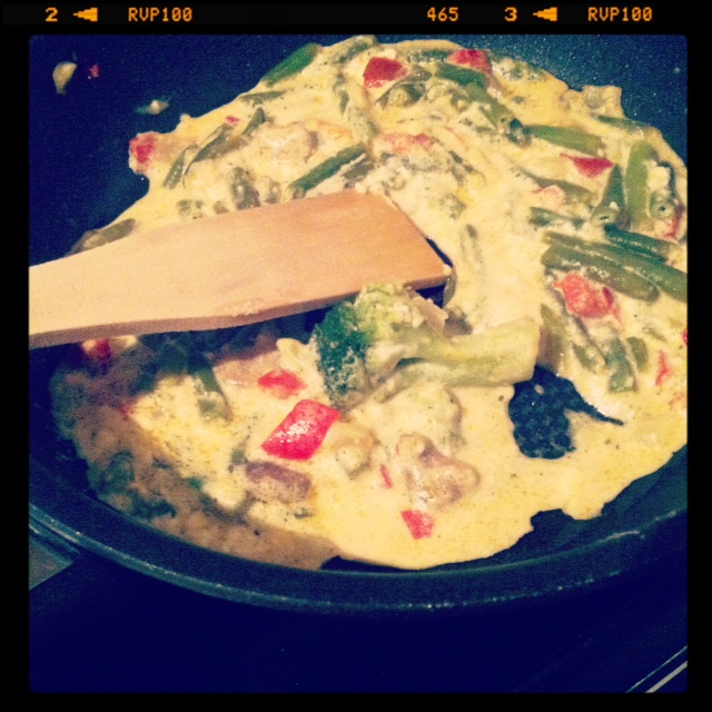 Légumes : Faire revenir une poêlée de légumes au choix ( poivrons, haricots, champignons et brocolis pour moi) avec de la crème fraiche et de la fêta nature ( j’en ai mis le 1/4 d’une boite de fêta salakis).Laisser mijoter. Salez, et poivrez.